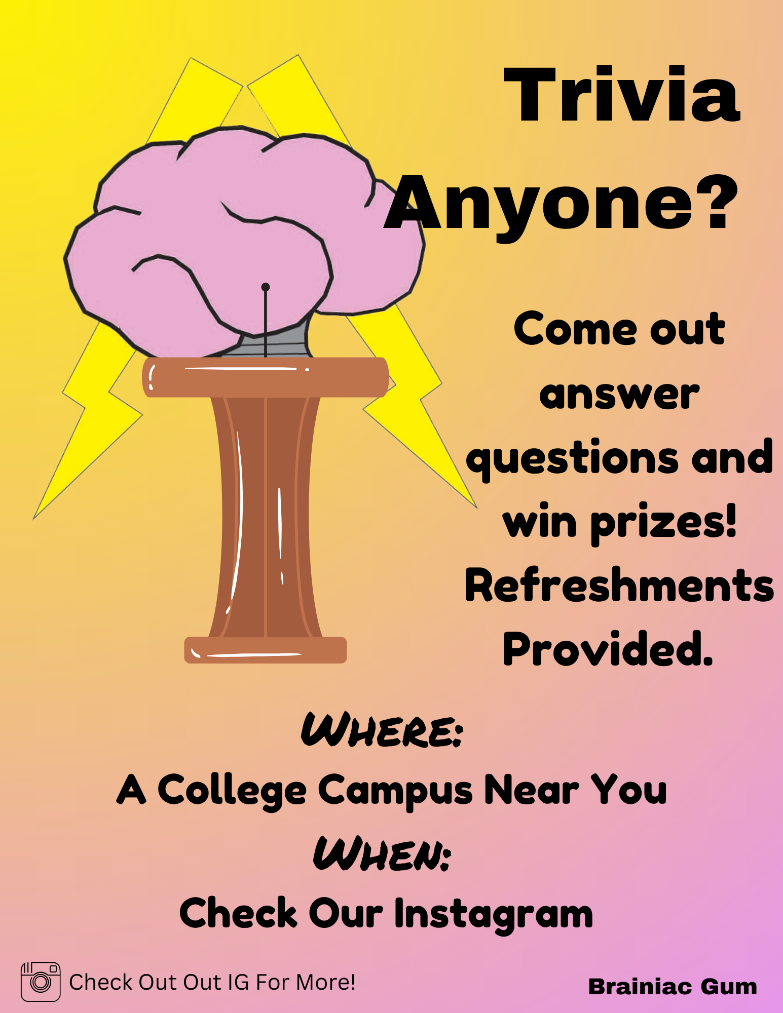 - Trivia Events on College Campuses: Hosting engaging and interactive trivia sessions on various academic subjects, promoting Brainiac Gum as a learning aid and creating a fun learning atmosphere.