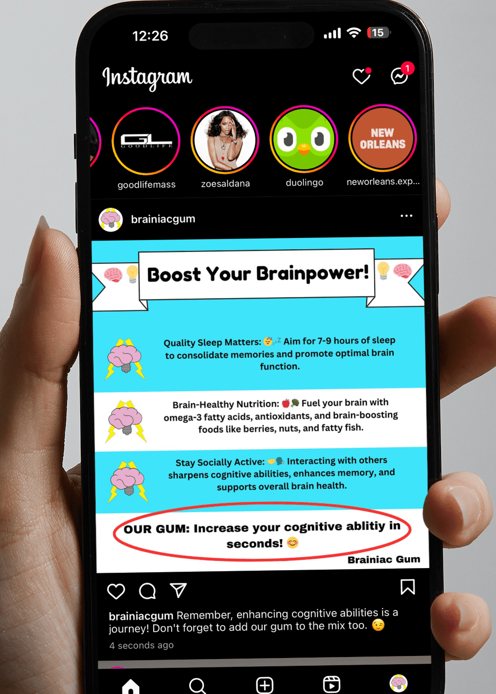 - Digital Campaigns and Social Media: Creating fun, educational content, study tips, and brain-boosting exercises on social media platforms to engage students and promote Brainiac Gum’s benefits.