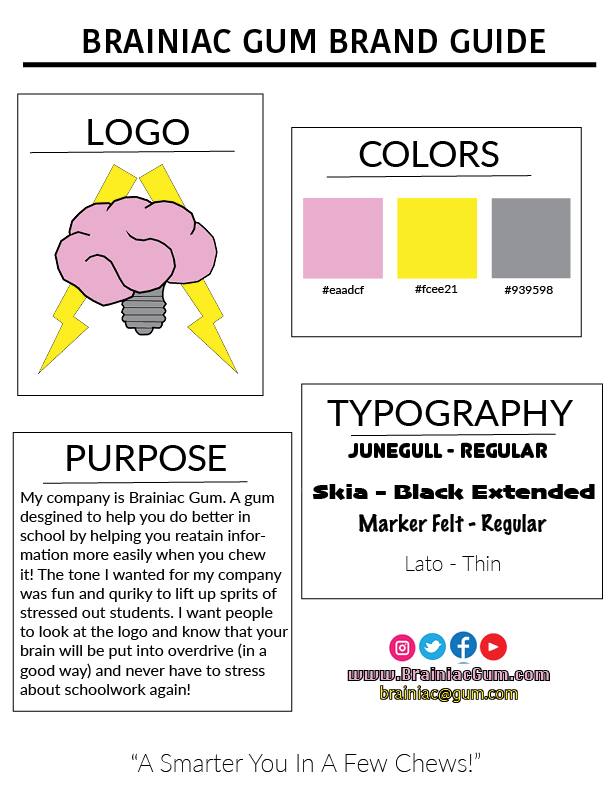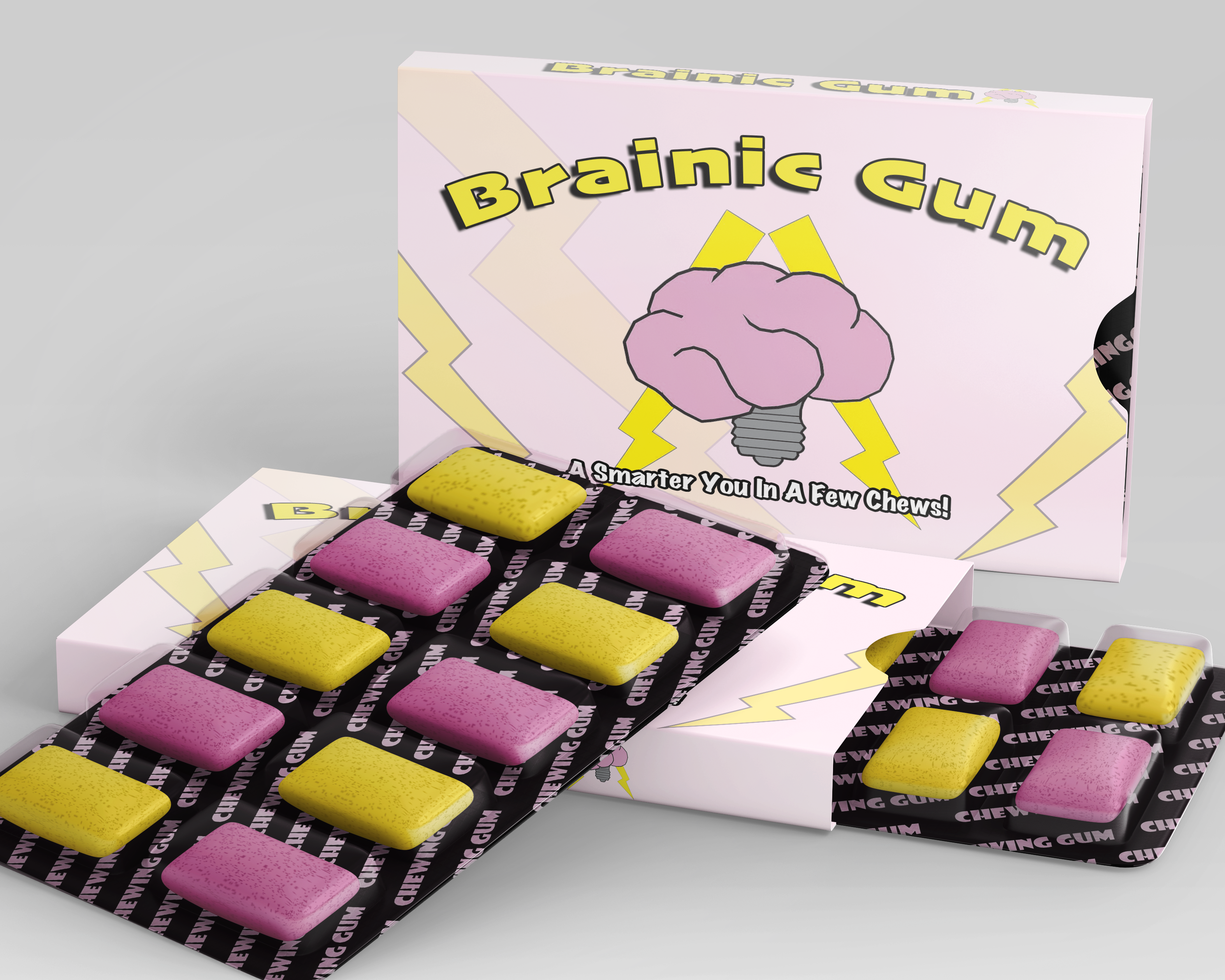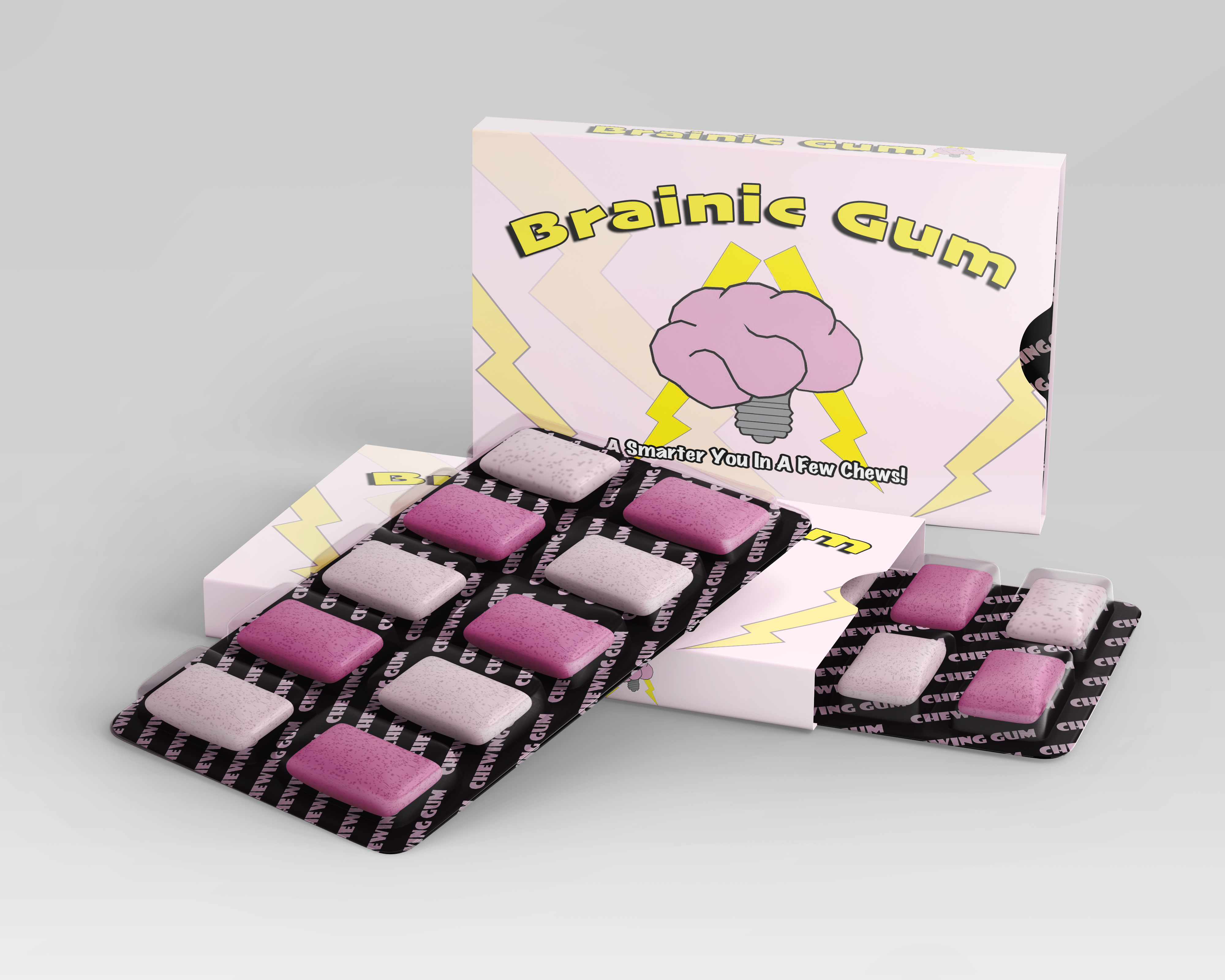 Brainiac Gum aims to enhance students’ cognitive abilities and aid memory retention, providing a fun and quirky solution to alleviate stress and assist in academic performance. The challenge is to establish a brand identity that signifies enhanced brainpower and stress-free learning.
